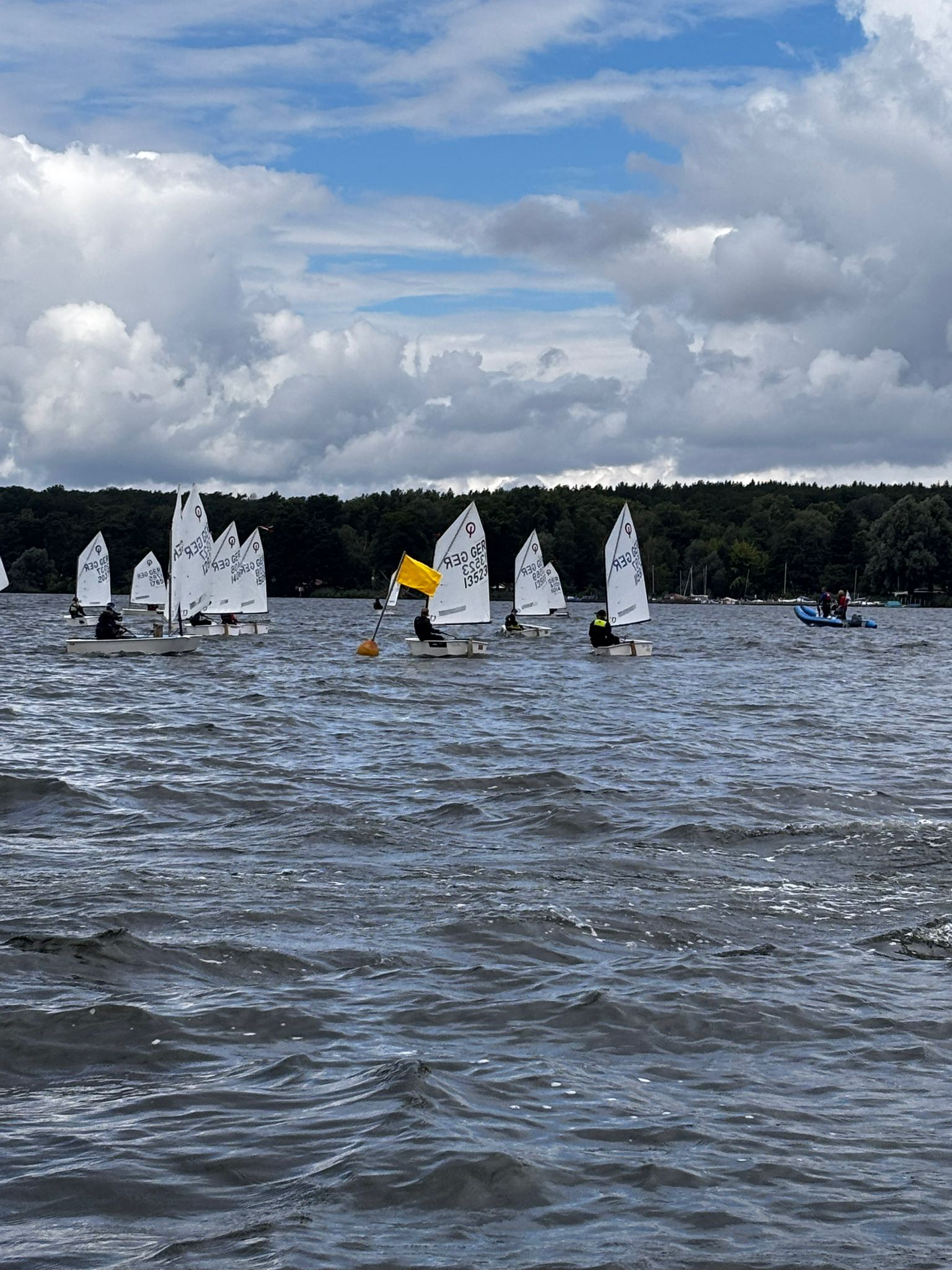 Am zweiten Tag sind wir wieder früh aufgestanden und aufs Wasser gefahren. Erst sah es so aus, als ob gar kein Wind wäre. Aber hinter Schwanenwerder, im Regattagebiet, kam zum Glück ein bisschen Wind – und wir konnten segeln. Es gab an dem Tag auch ein paar kleine Regenschauer, aber das war alles nicht schlimm.
