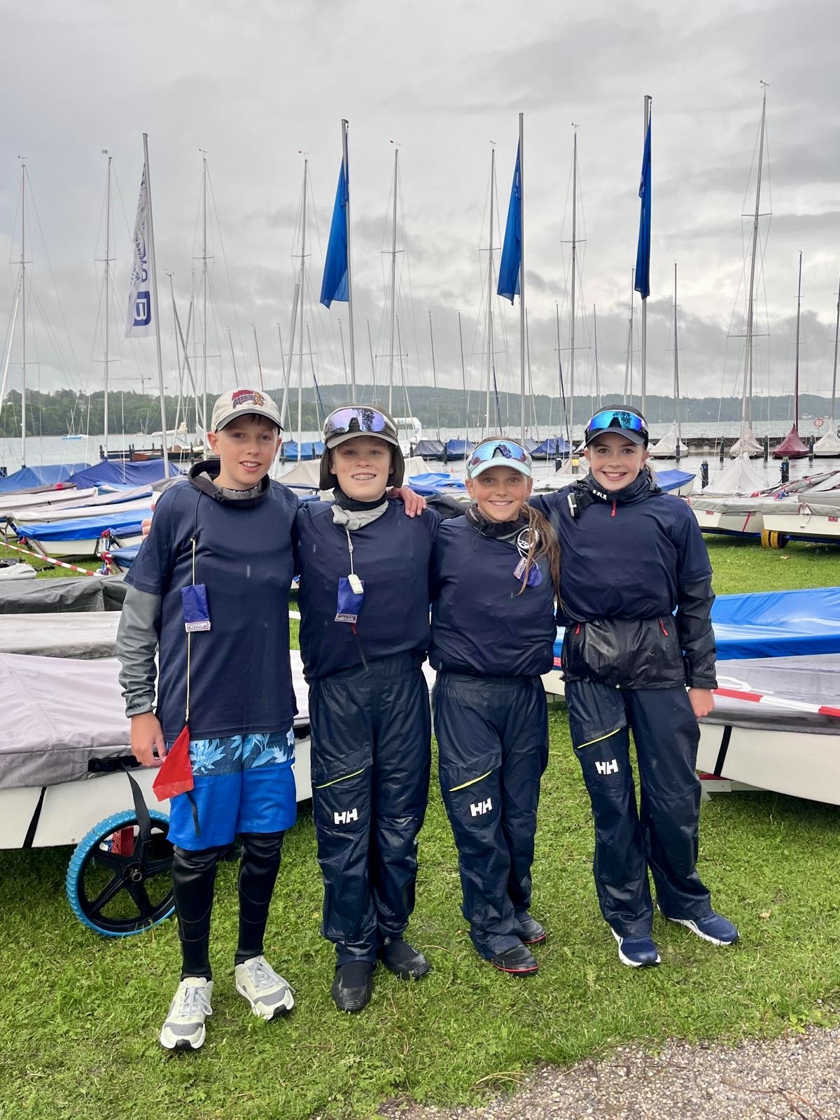 Am Freitag, 1. August ging es um 6 Uhr morgens in Berlin los. Nachdem wir nach einer langen Fahrt mit einer ausführlichen Team-Race-Taktik-Besprechung endlich Starnberg erreicht hatten, erkundeten wir erstmal das Gelände vom Bayerischen Yacht Club. Nachdem wir beim Abladen komplett vom Regen durchnässt waren, ging es für das Team-Race-Team (Hannah, Helene, Flori und Immo) auch schon zur Vermessung, die ohne Schwierigkeiten verlief. Nachdem alle die Boote wieder aufgebaut hatten, waren wir noch bei unserer Gastfamilie zu Pizza und Eisrolls eingeladen. Vor dem Schlafen gehen, gab es noch ein kleine Teambesprechung – ganz ohne Trainer. Hier haben wir die Taktik und die Rollen besprochen und verteilt. Nach langem hin- und her wurde Helene zur Piratin auserkoren. Was ist ein Pirat: dieser macht einen guten Start und fährt so schnell wie möglich zu Tonne 1, um dort falls nötig, dem gegnerischen Team eine „Falle“ zu stellen. Außerdem gab es noch die Startchefin Hannah: sie steht in der Peilung, hat die Zeit im Blick und sagt, wer über der Linie ist. Flori und Immo waren unsere Stressmacher, die mindestens drei Boote aus dem gegnerischen Team beschäftigen, so dass Piratin und Startchefin frei agieren können.