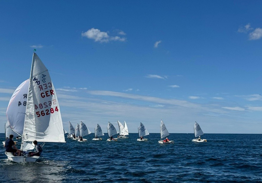 Am Sonntag segelten wir zwei Einheiten, unter anderem auch längere Strecke. Vormittags standen Trimmstarts auf dem Plan, bei Windstärken um 5–6 Beaufort. Gerade für die jüngeren Optis wurde es dabei ziemlich wild: Hohe Wellen, viele Kenterungen und vollgelaufene Boote sorgten für reichlich Action. Als wir wieder im Hafen waren, waren alle ganz froh. Am Abend redeten wir noch lange über die Erlebnisse des Tages, spielten Werwolf und freuten uns auf die nächsten Einheiten.
