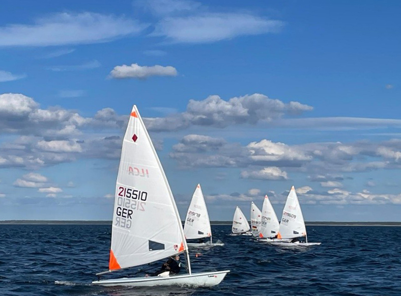 Schon früh am Morgen machten wir uns auf den Weg nach Warnemünde. Nach dem Abladen und Aufbauen der Boote nutzten die ILCA 6-Segler sofort die erste Chance zum Segeln. Die ILCA 4-Gruppe verbrachte noch etwas Zeit an Land und gönnte sich mit Bruno ein Eis.