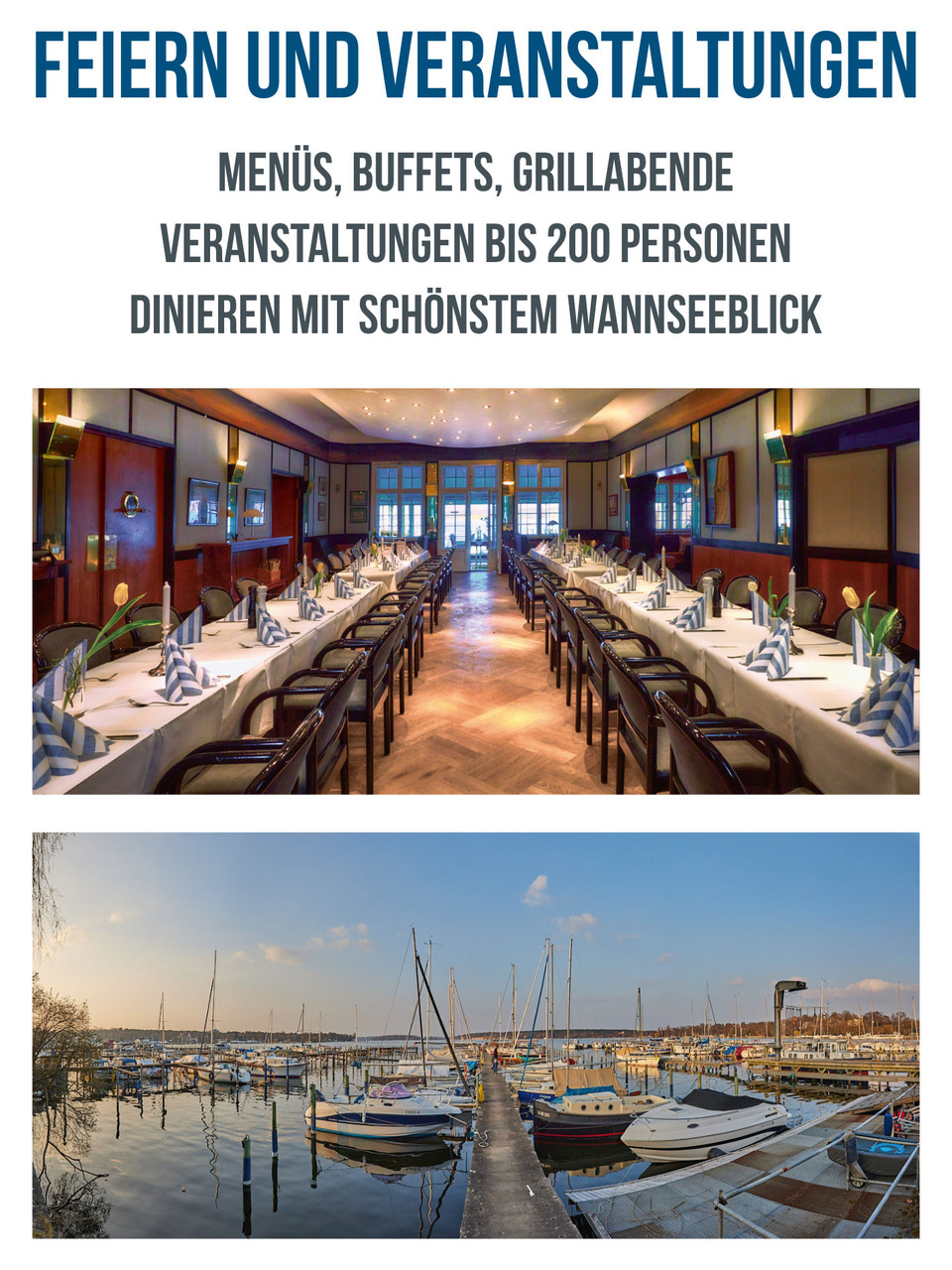 Genießen Sie unvergessliche Momente in stilvollem Ambiente – ob beim genussvollen Dinieren, ausgelassenen Feiern oder kulinarischen Verwöhnmomenten. Wir gestalten für Sie exquisite Menüs, vielfältige Buffets und stimmungsvolle Grillabende für bis zu 200 Gäste – und das alles mit einem atemberaubenden Blick auf den Wannsee.