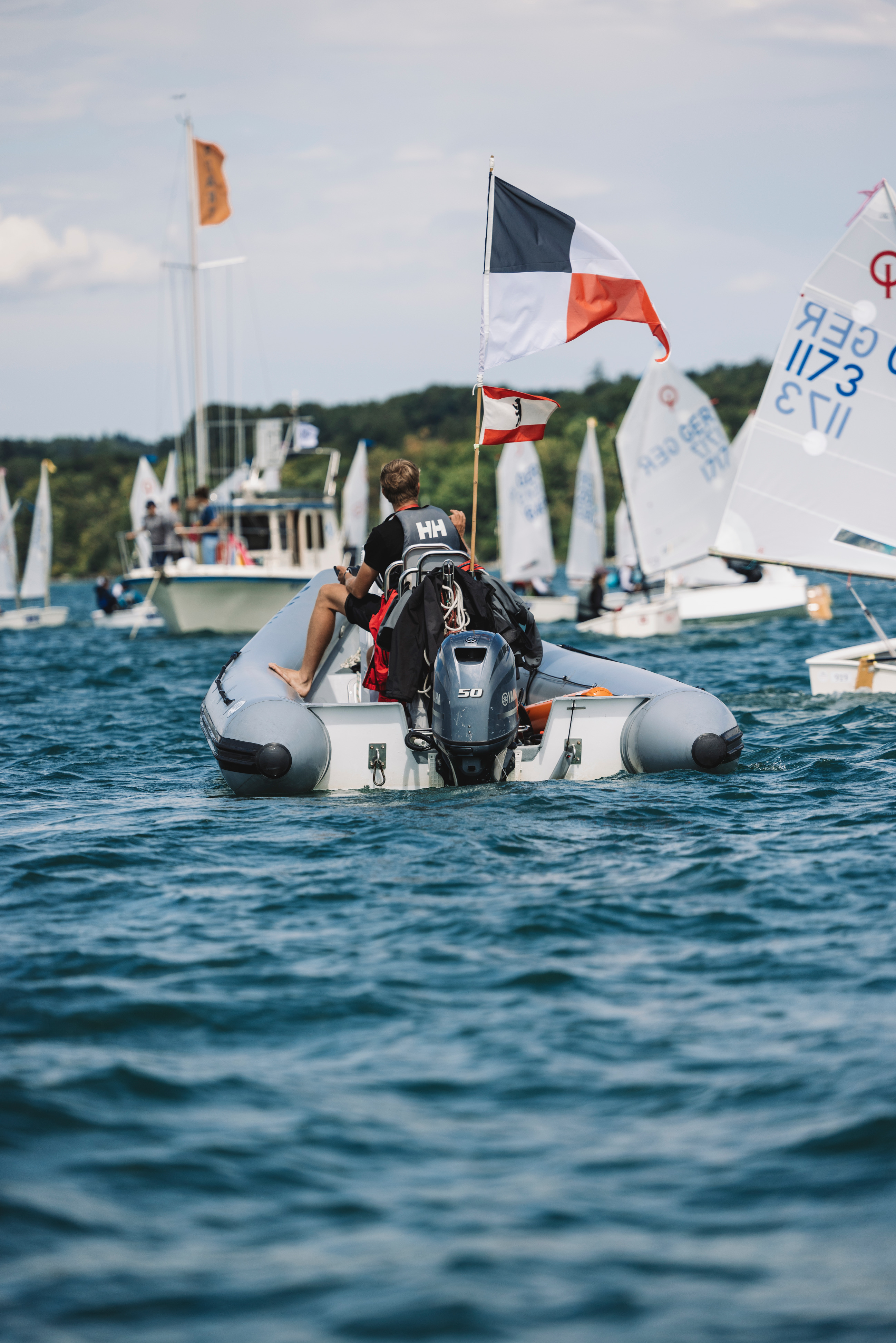 Am Freitag, 1. August ging es um 6 Uhr morgens in Berlin los. Nachdem wir nach einer langen Fahrt mit einer ausführlichen Team-Race-Taktik-Besprechung endlich Starnberg erreicht hatten, erkundeten wir erstmal das Gelände vom Bayerischen Yacht Club. Nachdem wir beim Abladen komplett vom Regen durchnässt waren, ging es für das Team-Race-Team (Hannah, Helene, Flori und Immo) auch schon zur Vermessung, die ohne Schwierigkeiten verlief. Nachdem alle die Boote wieder aufgebaut hatten, waren wir noch bei unserer Gastfamilie zu Pizza und Eisrolls eingeladen. Vor dem Schlafen gehen, gab es noch ein kleine Teambesprechung – ganz ohne Trainer. Hier haben wir die Taktik und die Rollen besprochen und verteilt. Nach langem hin- und her wurde Helene zur Piratin auserkoren. Was ist ein Pirat: dieser macht einen guten Start und fährt so schnell wie möglich zu Tonne 1, um dort falls nötig, dem gegnerischen Team eine „Falle“ zu stellen. Außerdem gab es noch die Startchefin Hannah: sie steht in der Peilung, hat die Zeit im Blick und sagt, wer über der Linie ist. Flori und Immo waren unsere Stressmacher, die mindestens drei Boote aus dem gegnerischen Team beschäftigen, so dass Piratin und Startchefin frei agieren können.