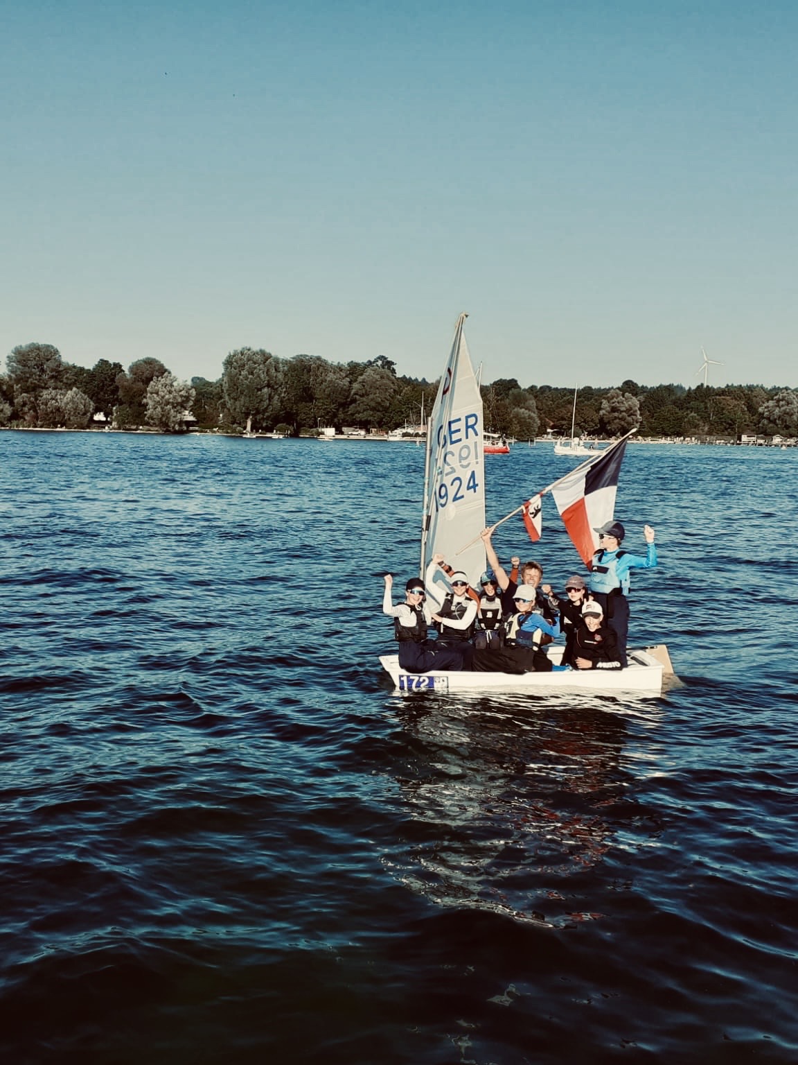 Die Bronzefleet schaffte gerade noch ein Rennen auf dem Innerloop während die Rennen der Silber- und Gold-Fleet auf dem Outerloop aus Windmangel abgebrochen werden mussten. Um 12:30 Uhr kam dann der finale Abbruch. Bei Windstille und bestem Sommerwetter fuhren noch mal alle raus, die auf der Deutschen ihre letzte Regatta im Opti gesegelt sind und nun in eine andere Bootsklasse umsteigen. Wir haben Immos Opti durchgekentert, uns hinterm Mobo herziehen lassen und die anderen nassgespritzt. Das war sehr emotional; da wir eine so tolle Gruppe sind, fällt der Abschied besonders schwer und ist traurig.